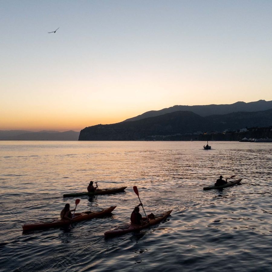 Si parte in kayak alle prime luci dell’alba, quando il sole timidamente appare dietro il profilo della Penisola Sorrentina. I primi raggi dorati accarezzano le acque cristalline, che ondeggiano dolcemente al ritmo della brezza mattutina, regalando un’atmosfera di pura magia.